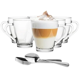 Glasmark KROSNO 1992 zestaw 6 szklanek do kawy 200 ml z uchwytem i łyżeczką przezroczyste szklane szklanki do herbaty Cappuccino Latte mrożona herbata termoaktywna