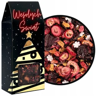 "Zimowy ogród" - herbata świąteczna owocowa 70 g herbata w świątecznym opakowaniu Ta wyjątkowa świąteczna herbata owocowa to esencja świątecznych smaków i aromatów. Słodko-kwasowaty hibiskus harmonijnie łączy się z nutami jabłka, żurawiny, truskawki i wiśni, tworząc soczystą i pełną smaku kompozycję. Dekoracje cukrowe oraz delikatna skórka róży dodają tej mieszance wyjątkowego, świątecznego charakteru, sprawiając, że jest ona idealna na chłodne, zimowe wieczory. Składniki: hibiskus dekoracje cukrowe (cukier, mąka ryżowa, olej ryżowy, skrobia ziemniaczana, aromat) skórka róży jabłko żurawina liofilizowana truskawka liofilizowana wiśnia liofilizowana aromat (kompozycja owoców 38%) Poczuj magię świąt!Pudełko "Wesołych Świąt" eleganckie pudełko z nadrukiem w kształcie choinki wewnątrz herbata zapakowana w dodatkową torebkę czarno-złoty świąteczny kolor elegancki świąteczny zadruk złocenia na grafikach gotowy pomysł na prezent Wymiary opakowania: wysokość 17,7 cm szerokość 7,7 cm głębokość 4,2 cm