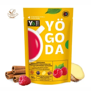 miód 46,5 %, malina 39 %, czarna porzeczka 8,9 %, imbir 4,9 %, regulator kwasowości: kwas cytrynowy, cynamon mielony 0,2 %. Sposób parzenia: Zawartość saszetki wycisnąć do kubka (200–300 ml), zalać gorącą, zimną lub gazowaną wodą. Wymieszaj, odczekaj 3 minuty i ciesz się! Dla kogo YOGODA może być bardziej odpowiedni: