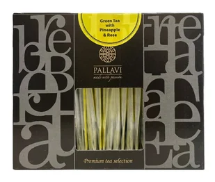 Pallavi Green & Rose to zielona herbata z dodatkiem kawałków słodkiego ananasa, aromatycznych płatków róży i tropikalnym akcentem marakui. Opakowanie zawiera 25 ekskluzywnych saszetek z herbatą, idealne do dzbanka o pojemności 500 ml.