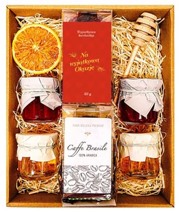 KOSZ ZESTAW PREZENTOWY PREZENT UPOMINEK MIÓD HERBATA KONFITURA NA URODZINY