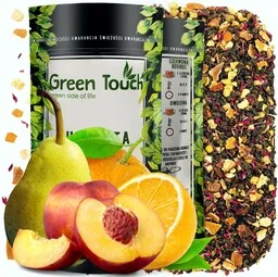 Pomarańcza & brzoskwinia Mieszanka ta to doskonały wybór dla wielbicieli orzeźwiających owocowych smaków. Zielona herbata gunpowder, która jest zwinięta w kuleczki to tło dla wyrazistych aromatów skórki pomarańczowej, słodkiej brzoskwini i gruszki. Składniki: herbata zielona Gunpowder super, skórka pomarańczowa, gruszka suszona, brzoskwinia liofilizowana, bławatek różowy, aromat. Wartość odżywcza w 100g: wartość energetyczna 242,0 kJ / 57,0 kcal, tłuszcze 0,0 g, węglowodany 12,0g (w tym cukry 11,0g), błonnik 1,6g, białko 0,7g, sól 0,0g, sód 0,0g.