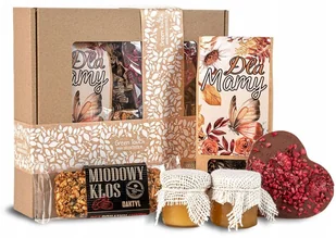 Idealny prezent na Dzień Matki: herbata owocowa, baton miodowy, czekolada serce, konfitura, miodek pomarańczowy.