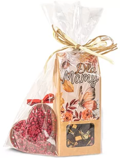 Prezent upominek dla mamy herbata z czekoladowym sercem w celofanie Ten uroczy zestaw prezentowy dla mamy zawiera smakowitą herbatę liściastą z owocami, czekoladę w kształcie serca oraz elegancką folię celofanową z kokardą z rafii. Całość zapakowana i gotowa do wręczenia! Zestaw prezentowy zawiera: Herbata liściasta premium 60 g. Herbata czarna smakowa z dodatkami różnych owoców w okazjonalnym białym pudełku “Dla Mamy”. Składniki: herbata czarna Ceylon OP, papaja kandyzowana (papaja, cukier), jabłko suszone, ślaz, róża płatki, nagietek, bławatek, aromat.