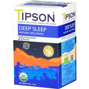 Organiczna, uspokajająca herbata ziołowa skomponowana z rumianku, trawy cytrynowej, bazylii, ashwagandhy oraz gałki muszkatołowej. Naturalna kompozycja, która pomoże Ci ukoić nerwy i poprawić jakość snu. Herbata Tipson Deep Sleep sprawi, że poczujesz się lepiej niż kiedykolwiek. Wszystko za sprawą starannie dobranych 100% naturalnych, organicznych składników pochodzących z ekologicznych upraw, czego potwierdzeniem są certyfikaty USDA ORGANIC oraz Rolnictwa Ekologicznego. Saszetki pakowane oddzielnie, pełen aromat i świeżość w każdej filiżance.
