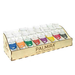 Cudowny zestaw herbat PALMIRA 8 smaków + ekspozytor do domu, kawiarni, biura, salonu, restauracji. Zestaw zawiera 80 porcji herbaty w saszetkach, po 10 porcji każdego z następujących smaków: English Breakfast - herbata czarna. Klasyczna mieszanka wyrazistych czarnych herbat. Gunpowder - herbata zielona.