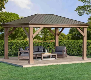 Altana ogrodowa 3,7x4,9 m Westmann, wykonana z egzotycznego drewna cedrowego, zabezpieczona bejcą, z dachem w kolorze brązowym wykonanym z aluminium.