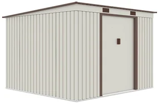 Spadzisty dach z blachy skutecznie odprowadza wodę opadową, eliminując ryzyko obciążenia konstrukcji. Najważniejsze cechy: Wymiary z dachem 261x241 cm Wysokość drzwi 157 cm Kolor: Beige Podwójne drzwi przesuwne Cyrkulacja powietrza Nie wymaga konserwacji Możliwość zamontowania kłódki na drzwiach Całoroczny Otwory wentylacyjne Spadzisty dach Łatwy montaż, bez specjalistycznej wiedzy technicznej Odporny na korozję Nie zawiera podłogi Stalowa konstrukcja Dane techniczneWymiary domku u podstawy: szerokość: 251 cm głębokość: