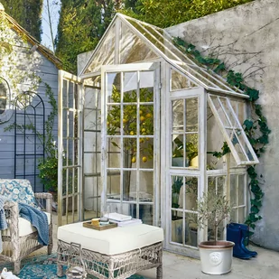 Materiał, z którego go wykonano, to masywne żelazo i szkło syntetyczne, dzięki czemu jest trwały i odporny na działanie wiatru, pogody, deszczu, śniegu i lodu. Dzięki dużym drzwiom i oknom w środku zawsze jest miło i jasno, a dach zachwyca urokliwy pokryciem przypominającym dachówkę. A skoro już o wyglądzie mowa – wykończenie starannie nakładano ręcznie, co nadaje temu eleganckiemu domkowi wspaniały antyczny wygląd.
