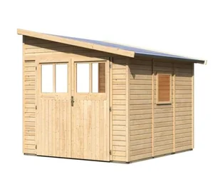 Dom drewniany do ściany, grubość ściany 19 mm, wymiary sz 238 x gł 268 cm, powierzchnia zewnętrzna domu 6,37 m2.