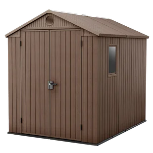 Domek ogrodowy, brązowy DARWIN 6×8 od marki KETER. Wykonany z tworzywa sztucznego odpornego na wodę, śnieg i promieniowanie UV. Obróbka powierzchni w imitacji drewna. Dostępny w kolorze brązowym. Wymiary drzwi 119 × 187,5 cm.