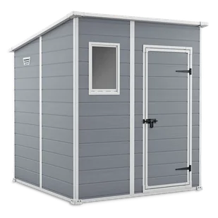 Szopa ogrodowa Manor Pent 66 firmy Keter pomieści całą gamę narzędzi i sprzętów. Domek ma spadzisty dach i drzwi, które ułatwiają dostęp. Wąski design maksymalizuje dostępna przestrzeń i ułatwia montaż przy płocie lub ścianie budynku. Wykonana z odpornego na warunki atmosferyczne i nie wymagającego konserwacji plastiku, szopka jest bardzo trwała, wytrzymała i odporna na rdzę, niszczenie i inne uszkodzenia. Charakteryzuje ją nowoczesny wygląd z szarymi ścianami z białymi krawędziami.