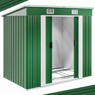 196 x 122 x 182 cm Wysokość okapu: 159 cm Wysokość kalenicy: 181 cm Prześwit drzwi (szer. x wys.): 75 x 152 cm Kolor: Zielony Wymiary dachu:
