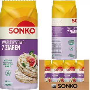 SONKO WAFLE 7 ZIAREN Z RYŻEM DZIKIM 130 G - ŹRÓDŁO BŁONNIKA Wafle ryżowe SONKO 7 ziaren produkowane są z aż 7 różnych dodatków. Źródło błonnika i doskonały zamiennik klasycznego pieczywa. Idealne do tworzenia pysznych, fantazyjnych kanapek, ale też do samodzielnego chrupania w każdym momencie. W składzie wafli znajdziemy bogatą kompozycję ziaren. To słonecznik, kukurydza, kasza gryczana nieprażona, amarantus, siemię lniane, kasza jaglana i brązowy ryż.