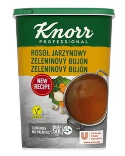Rosół jarzynowy Knorr Professional 1 kg Nowa ulepszona receptura o aromatycznym, wyrazistym smaku warzyw, o obniżonej zawartość soli pozwala na doprawienie potrawy zgodnie z własnym upodobaniem. Produkt klarowny, bez kawałków suszonych warzyw i ziół nie wymaga odcedzania. Odpowiedni dla wegan i wegetarian. Składniki maltodekstryna, sól, ekstrakt drożdżowy, aromaty, cukier, olej słonecznikowy, cebula w proszku¹ (2,2%), przyprawy (korzeń lubczyka¹, kurkuma¹), sok z marchwi w proszku¹ (0,3%), czosnek w proszku¹, ekstrakt z warzyw 0,09% (kapusta włoska (0,05%), brukiew). ¹Z upraw zrównoważonych.