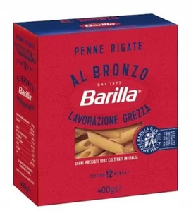 Barilla Penne Rigate al Bronzo włoski makaron rurki 400 g Makaron Barilla wyprodukowany jest z najlepszej pszenicy twardej (durum), bez której nie można stworzyć prawdziwego makaronu o cenionej powszechnie właściwości al dente. Makaron taki podczas gotowania nie skleja się, jest sprężysty i zachowuje swój kształt. Linia makaronów Al Bronzo wytwarzana jest w procesie Surowej Obróbki. Ciasto wytłaczane jest przez matryce z brązu z wkładkami wzbogaconymi mikrograwerami, które nadają makaronowi intensywną chropowatość. Zdefiniowane i wyraziste rowki penne rigate sprawiają, że format jest elegancki dla oka i decydujący dla podniebienia.