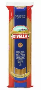 Divella Fettuccine n12 włoski makaron 500g Historia makaronu Divella rozpoczęła się w 1890 roku w małym rolniczym miasteczku w prowincji Bari, Rutigliano, kiedy Francesco Divella otworzył swój pierwszy młyn do mielenia pszenicy durum. Fabryka makaronów Divella produkuje szeroką gamę makaronów w bardzo przystępnej cenie, zawsze zachowując dobrą jakość. Divella Fettuccine prosty makaron w formie szerokich, spłaszczonych wstążek. Najlepiej nadaje się do kremowych sosów oraz również do lekkich sosów bez większych kawałków mięsa czy warzyw aby nie opadły na dno talerza.
