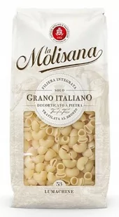 La Molisana Lumachine n. 53 włoski makaron 500 g Na naszej ziemi Molise, która pozostaje dziewicza i dzika, oferując urzekające krajobrazy, cieszymy się przyjemnym surowym klimatem i rzadkim przywilejem czystego i rozrzedzonego powietrza typowego dla wzgórz Apeninów. W tej krainie rodzą się makarony, ponad 100 formatów, które zachowują nienaruszone oczekiwania dotyczące smaku, niezawodności w gotowaniu i niepowtarzalnego smaku, jak Lumachine 53. Makaron Lumachine to rodzaj krótkiego makaronu z pszenicy durum przygotowywanej tradycyjną metodą. Lumachine są kształcie małych gładkich kolanek.