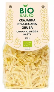 Im więcej jaj tym bardziej makaron jest kaloryczny i sycący. BIOnaturo oferuje Makaron krajankę 2- jajeczną w wersji cienkiej lub grubej, która doskonale nadaje się np. do rosołu, warzywnego bulionu czy pomidorowej zupy. Jego składniki są świeże, naturalne i pochodzą tylko z certyfikowanych upraw ekologicznych. Wyprodukowany jest on z pszenicy durum i świeżych jaj dzięki czemu charakteryzuje się wysoką jakością oraz doskonałym smakiem.