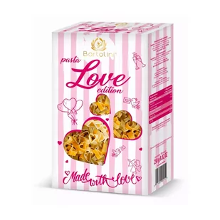 Makaron Serca Durum 250g - Bartolini Opis produktu Makaron Serca Durum marki Bartolini to makaron którego ciekawy kształt w kształcie serc jest idealną propozycją dla zakochanych i nie tylko. Czy można sobie wyobrazić bardziej romantyczną sytuację niż kolacja we dwoje - podajesz świetnie przygotowany makaron, który okazuje się malutkimi serduszkami. Wspaniały pomysł na romantyczny, a przy tym bardzo smaczny i twórczy prezent. Kolorowe serduszka zapewnią, iż ten posiłek będzie naprawdę niezwykłym przeżyciem. Masa netto:
