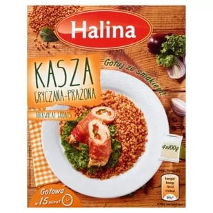 HalinaKasza gryczana - prażonaKasza gryczana Halina produkowana jest z najwyższej jakości gryki, charakteryzuje się złocisto-brązową barwą ziarna oraz swoistym smakiemZawartość opakowania: Opakowanie zawiera 4 woreczki kaszy po 100gKarton4 x 100 g400 gPorcja 50 g energia 734 kJ 174 kcal 9%*, w 100 g: 1467 kJ/347 kcal , * RWS - Referencyjna wartość spożycia dla przeciętnej osoby dorosłej (8400 kJ / 2000 kcal).