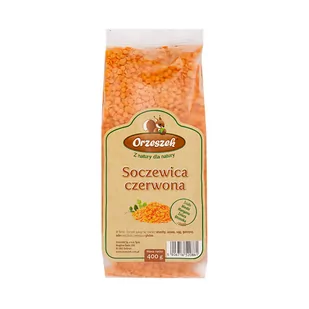 Soczewica czerwona Orzeszek 400 g Soczewica czerwona Orzeszek Znana od czasów prehistorycznych zawiera: kwas foliowy, skrobia, wapń, fosfor oraz żelazo. Ponadto soczewica ma bardzo niski indeks glikemiczny i z powodzeniem może być stosowana podczas diet. Przeznaczenie: ✔ zup ✔ sosów ✔sałatek ✔ Gwarancja jakości Kraj pochodzenia: