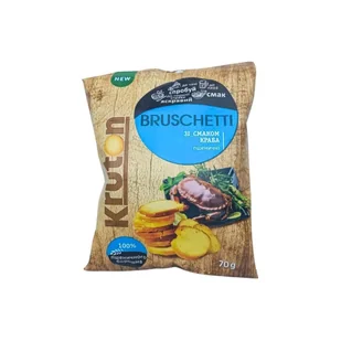 Nazwa Grzanki Brusketty o smaku kraba ""Kruton"" 70g Masa netto: 70 g. Składniki: chleb (mąka pszenna 74%, woda, drożdże prasowane, cukier, tłuszcz specjalny: oleje roślinne), sól, kompleksowy dodatek do żywności (stabilizator: węglan wapnia, mąka pszenna, emulgator diacetylowy: glicerol i estry kwasów tłuszczowych, przeciwutleniacz: kwas askorbinowy), polepszacz mąki i pieczywa (L-cysteina), środki technologiczne (enzymy), olej słonecznikowy, kompleksowy dodatek do żywności „Krab” 5% (sól, serwatka w proszku, glukoza spożywcza krystaliczna uwodniona, maltodekstryna (ziemniaczana), cukier, aromaty, wzmacniacze smaku i aromatu: 1-podstawiony glutaminian sodu, 2-podstawiony 5'-guanylan sodu, 2-podstawiony 5'-inozynian sodu). Wartość odżywcza na 100 g produktu: wartość energetyczna – 1687,2 kJ / 402,98 kcal, tłuszcze – 7,5 g, w tym kwasy tłuszczowe nasycone – 0,88 g, węglowodany – 74,17 g, w tym cukru – 3,5 g, białko – 9,7 g, sól – 2,36 g. Kraj pochodzenia: