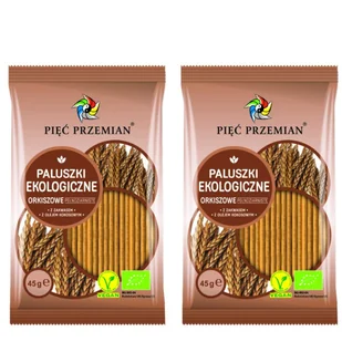 Pięć Przemian Paluszki orkiszowe pełnoziarniste Zestaw 2 x 45 g Bio. Słodycze lub przekąska. Paluszki orkiszowe pełnoziarniste Zestaw 2 x 45 g Paluszki ekologiczne orkiszowe pełnoziarniste to pyszna i zdrowa wegańska przekąska