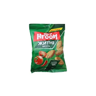 Sucharki bagietkowe żytnie o smaku Pomidor chili "TM Hroom" 90g Masa netto : 90 g. Składniki: sucharki (mąka żytnia 55%, mąka kukurydziana, otręby pszenne, mąka pszenna, słód żytni 6%, sól, olej słonecznikowy rafinowany, dezodoryzowany), olej słonecznikowy rafinowany, dezodoryzowany, złożony dodatek spożywczy „Pomidor chili” 3,5% (sól, maltodekstryna, cukier, proszek pomidorowy 7,5%, przyprawy, cebula suszona mielona, wzmacniacze smaku i aromatu [glutaminian sodu, 5’-ribonukleotydy disodowe], czosnek suszony mielony, aromat, środki przeciwzbrylające [dwutlenek krzemu amorficzny, wodorowęglan magnezu], oleje roślinne [oliwa z oliwek z pierwszego tłoczenia, olej słonecznikowy], regulatory kwasowości [kwas cytrynowy, kwas jabłkowy], skrobia, błonnik ryżowy, przeciwutleniacz [ekstrakt z rozmarynu]), złożony dodatek spożywczy „Pomidor chili” 3,5% (cukier, sól, wzmacniacze smaku i aromatu [glutaminian sodu, 5’-guanylan disodowy, 5’-inozynian disodowy], regulator kwasowości [kwas cytrynowy], pomidor 2,5%, środek przeciwzbrylający [dwutlenek krzemu amorficzny], aromaty). Wartość odżywcza na 100 g produktu: wartość energetyczna – 1813 kJ / 431 kcal, tłuszcze – 14,0 g, w tym kwasy tłuszczowe nasycone – 1,4 g, węglowodany – 68,0 g, w tym cukru – 7,6 g, białko – 8,2 g, sól – 2,51 g. Kraj pochodzenia: