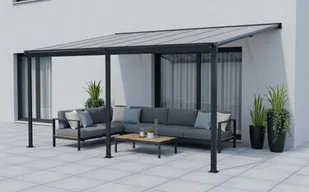 Pergola do ściany długość 4,35 x głębokość do ściany 3 m, kolor antracyt, dach - poliwęglan komorowy przezroczysty 6 mm.