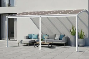 Pergola do ściany, długość 4,35 x głębokość do ściany 3 m, kolor biały, dach - poliwęglan komórkowy z brązu 6 mm.