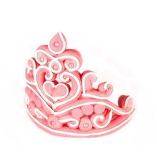 Przedstawia różową koronę z białymi dodatkami. W niektórych miejscach możemy również zauważyć nieśmiało wyróżniające się perełki. Dzięki takiemu połączeniu uzyskujemy spójną i estetyczną całość. Korona będzie się prezentować dobrze na każdym torcie, niezależnie od jego koloru czy rozmiaru. Zapewniamy, że taki drobny dodatek zapewni niezmienny uśmiech na twarzy każdej małej solenizantki.
