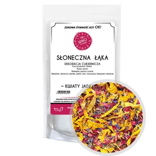 Parametry: Kraj produkcji: Polska Składniki: słonecznik płatek, róża czerwona płatek, bławatek niebieski Opakowanie: saszetka typu DOYPACK z zamknięciem strunowym Zastosowanie: torty praliny desery pączki czekolady itp.