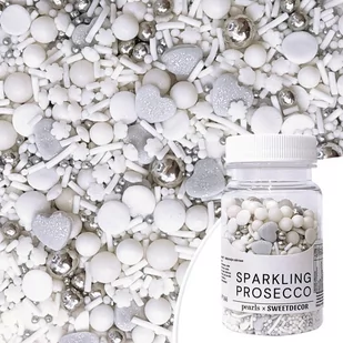 W opakowaniu znajduje się 70 g mieszanki cukrowych posypek: białe okrągłe confetti, białe perełki, metaliczne srebrne perełki o różnych rozmiarach, białe: kw...