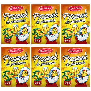 Wodzisław Proszek do pieczenia 30 g x 6 sztuk Wodzisław Proszek do pieczenia Nasz proszek do pieczenia to gwarancja udanych wypieków. Stworzony po to, aby Twoje ciasta rosły ku radości i zadowoleniu całej rodziny. Składniki: substancje spulchniające: difosforany E 450, węglany sodu E 500; mąka pszenna, olej roślinny rzepakowy. Wartości odżywcze: