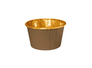 Foremki papierowe na muffinki w kolorze brązowym ze złotym brzegiem. Średnica: 5 cm. Wysokość papilotki: 4 cm. Opakowanie: 20 szt.