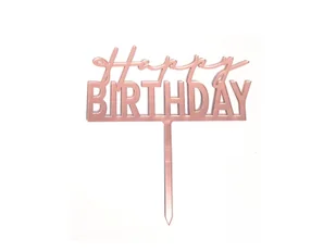 Napis Happy Birthday w kolorze złotego różu, idealna dekoracja tortu na urodziny. Dekoracja wykonana z pleksi. Wymiary: 10 x 11 cm. Opakowanie: 1 szt.