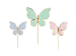 Papierowe toppery na tort pastelowe Motylki. Występują w trzech kolorach: niebieskim, zielonym oraz różowym. Idealna dekoracja tortu na urodziny. Pikery pasują do zestawu Jednorożec i Motylki.