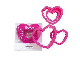 Zestaw plastikowych wykrawaczy do ciasteczek w kształcie pofalowanych serduszek. Wymiary: 4 cm, 5 cm, 6 cm, 8 cm. Opakowanie: 4 szt.
