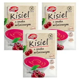 Kisiel o smaku wiśniowym Zestaw 3 x 40 gBezglutenowy kisiel o smaku wiśniowym to łatwy i szybki w przygotowaniu deser. Jest przysmakiem zarówno młodszych, jak i starszych łasuchów. Kisiele Celiko produkowane są wg tradycyjnych i sprawdzonych receptur, zgodnie z reżimami produkcji bezglutenowej oraz bez dodatku cukru.