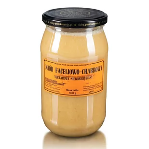 MIÓD FACELIOWO-CHABROWY 1050g, pyszny, słodki, nierozgrzewany, 100 lat tradycji, zdrowy Kolor/smak Ciemno-żółty. Wyczuwalny kwasek facelii oraz nuta goryczy chabra. MIÓD Z POLSKIEJ PASIEKI HAWRAN. Konsystencja Krupczasta z niewielkimi grudkami Przydatność do spożycia: 2lata Polecany przy* Charakteryzuje się bardzo wysoką zawartością lizozymu, który wytworzony jest poprzez gruczoły ślinowe i gardzielowe pszczół.