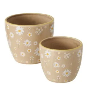 Zestaw dwóch ceramicznych donic w ciepłym beżowym odcieniu, ozdobionych ręcznie malowanymi stokrotkami, to wyjątkowa propozycja dla osób ceniących naturalny urok i dekoracje z duszą. Każda z donic wykonana została z ceramiki o delikatnym efekcie crackle, który nadaje im unikalny, rustykalny charakter. Motyw stokrotek wprowadza do wnętrza świeżość i pogodny nastrój, idealnie współgrając ze stylem boho, prowansalskim czy klasycznym. Różne rozmiary donic pozwalają na efektowne eksponowanie ziół, kwiatów lub roślin doniczkowych zarówno w domu, jak i na balkonie. To nie tylko praktyczny element wyposażenia, ale również wyjątkowa ozdoba, która doda Twojej przestrzeni przytulności i koloru.