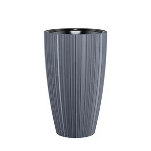 średnica góry - 36cm średnica podstawy - 27cm wysokość - 22cm pojemność wkładu - 13,7 l materiał - tworzywo sztuczne Doniczka z dołączonym wkładem, o prążkowanej fakturze pionowych żłobień. Piękny, nowoczesny wzór nada wnętrzu elegancji i przyciągnie wzrok gości, szczególnie w połączeniu z rośliną zieloną o dużych liściach. Donica odporna na promieniowanie UV i niskie temperatury, mrozoodporna. Idealna na zewnątrz m. in. do ogrodu, na taras.