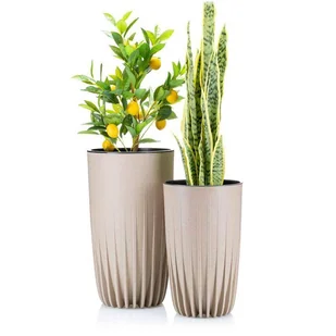 Nowoczesne, wysokie donice z wkładem, wyróżniające się smukłym, eleganckim kształtem, delikatną strukturą prążków, wykonane z mocnego tworzywa pochodzącego w 100% z recyklingu, do wnętrz i ogrodów, wymiary: 25xh42 cm, 30xh51 cm