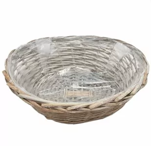36 cm wys. 17/14 cm Cechy produktu: wykonany z naturalnego materiału: wikliny; rękodzieło; wiklina naturalna: kolor szary beżowy, kształt okrągły lekko owalny; delikatnie węża się ku dołowi; w środku obszyty transparentną folią ochronną, zastosowanie dom i ogród. * podane wymiary mogą się nieznacznie różnić od podanych ze względu na ręczne wykonanie z naturalnego materiału