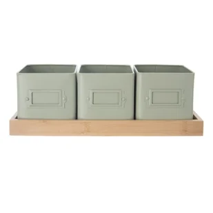 Doniczki są wykonane z metalu i mają praktyczną przegródkę na etykietę. Do doniczek dołączona jest bambusowa podstawka o wymiarach 37 x 13,5 x 3 cm.