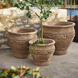 Ta osłonka doniczki – niczym relikt ze starej toskańskiej willi – prezentuje wszystkie cechy prawdziwego antyku. Ulepiono ją ręcznie z gliny zgodnie z najlepszymi tradycjami rzemieślniczymi, a dzięki wykończeniu w kolorze antycznego beżu przypomina klasyczne naczynia z terakoty, które pod wpływem południowego słońca straciły swój dawny żywy czerwony odcień – i to nadaje im szczególny urok. Pięknie rzeźbiony dekor przedstawiający liście palmowe jeszcze mocniej podkreśla antyczny charakter osłonki. To ozdoba, która – pojedynczo lub jako trio – roztacza relaksujący klimat skąpanych w słońcu śródziemnomorskich ogrodów i parków. Niech ten wysokiej jakości zestaw trzech osłonek wkrótce stanie się stylowym domem dla lawendy i oliwek, cytryny lub eukaliptusa.