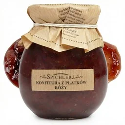 Konfitura z płatków róży różana dżem płatki róż aż 300 g herbata wypieki Produkt pasteryzowany. Tradycyjna receptura. Bez sztucznych barwników i konserwantów. Subtelna, aromatyczna i niezwykle elegancka - konfitura z płatków róży to prawdziwy klasyk dawnych spiżarni. Powstaje z płatków róży fałdzisto-listnej (19%), cukru i odrobiny kwasu cytrynowego, który delikatnie podkreśla naturalny, kwiatowy charakter konfitury.