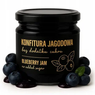 Konfitura Jagodowa bez dodatku cukru 190 g naturalnie słodki smak lasu Elegancka konfitura jagodowa bez dodatku cukru, w stylowym słoiku z czarnym wiekiem i ekskluzywną czarno-złotą etykietą. Produkt naturalnie słodzony sokiem jabłkowym, bez konserwantów i sztucznych dodatków. Idealny dodatek do śniadań, deserów oraz zdrowych przekąsek. Masa netto: 190 g Składniki: