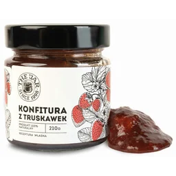 Konfitura z truskawek truskawkowa naturalna 210 g Konfitura z truskawek w wersji naturalnej to esencja lata zamknięta w słoiku. Głównym składnikiem są soczyste truskawki, dopełnione słodkością cukru trzcinowego i odrobiną soku z cytryn, a pektyna zapewnia idealną konsystencję. Doskonała do pieczywa, ciast czy jako dodatek do deserów. Składniki: truskawki 58%, cukier trzcinowy 39%, sok z cytryn, substancja zagęszczająca - pektyna. Objętość netto: